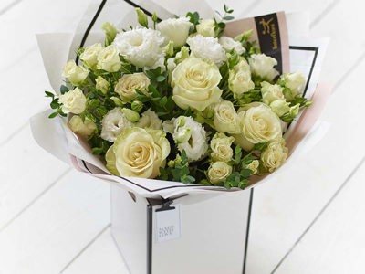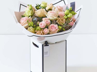 A relaxed collection of lush flowers tucked in a chic white gift wrap. Beautifully minimal, the lucky recipient has the creative freedom to arrange them just how they like.