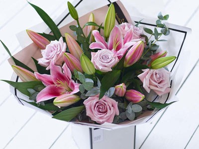 Simple mix of blush pink roses with complimentary eucalyptus, beautifully wrapped as the perfect gift.