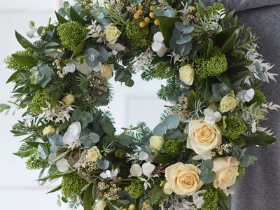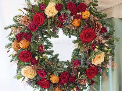 A touch lovelier than our standard wreath, this one will feature more blooms, or more luxurious blooms (or both!) It'll feature gorgeous fresh blooms and foliage. Expect shades of red and green, with peach and cream highlights and pops of burgundy and cerise.