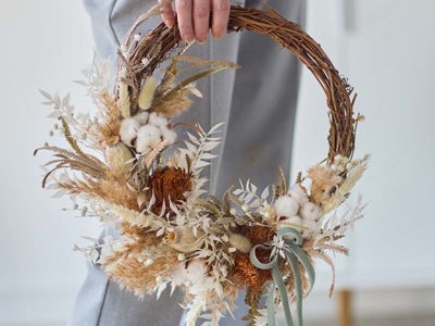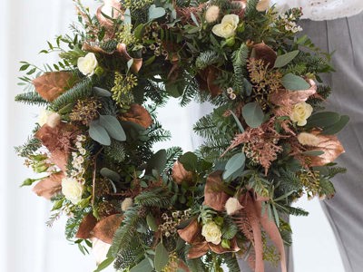 A touch lovelier than our standard wreath, this one will feature more blooms, or more luxurious blooms (or both!) in a fresh modern style. It'll feature gorgeous fresh blooms and foliage. Expect cerise and purple tones, plus blooms in soft pink, peach or lilac shades. It might also feature dried flowers or foliage painted in copper or rose gold.