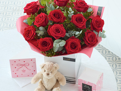 12 beautiful large headed red roses complimented by fresh foliage. This bundle comes with a box of Truffle chocolates, "I Love You" card and Teddy.