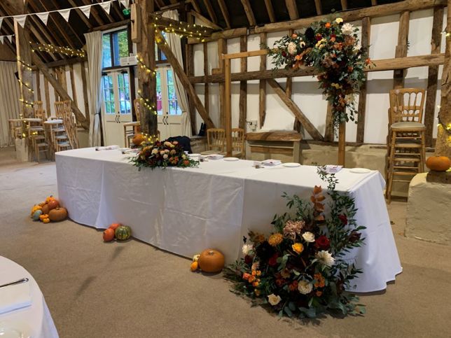 Dani and Alec brought the ultimate autumn vibes for their October 2024 wedding. With lots of pumpkins, squashes and deep orange tones, the barn style venue held warmth, suiting the season.