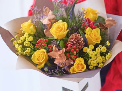 One for bringing colour and joy in the depths of winter. Featuring a mix of festive flowers and foliage as well as yellow roses.