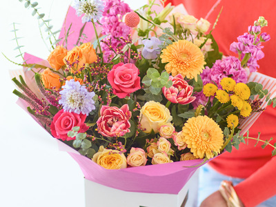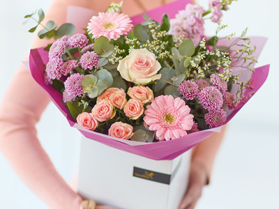 Fresh flowers and foliage in gentle pastel tones like peach, cream, and lilac, with pops of cerise. Perfect for mums who love softer colours.