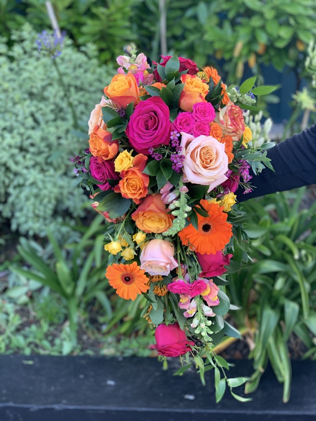 You can have a hand tied round bouquet or a teardrop design these are the most popular, there are a wide range of flowers to choose from depending on the time of year, Roses, Peonies and Lilies being the most popular.